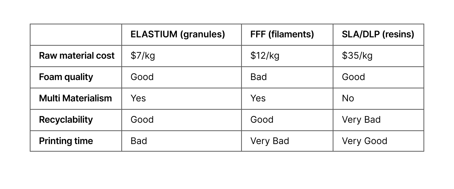Printing time. SLA/DLP is very fast. In contrast, all extrusion technologies are relatively slow. But filament extrusion is especially slow with soft materials. The softer the material or the higher the printing throughput - the higher chance of chewing the filament. Printing with soft filaments is never going to be as reliable or fast as printing with granules.